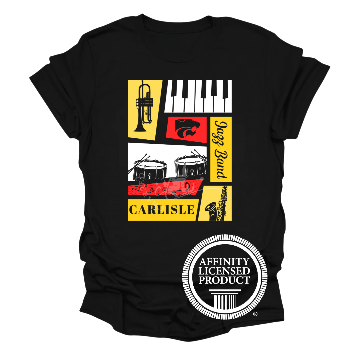Show your pride for the Carlisle Jazz Band with this bold, modern instrument collage design featuring trumpet, piano keys, snare drums, saxophone, and the iconic Wildcat logo โ all in classic Carlisle colors.